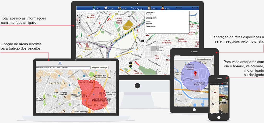 Configuração de áreas restritas para o tráfego dos veículos, com alertas em caso de entrada ou saída dessas zonas.